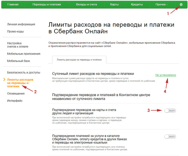 Отключение подтверждений в Контактном центре через настройки Сбербанк Онлайн.