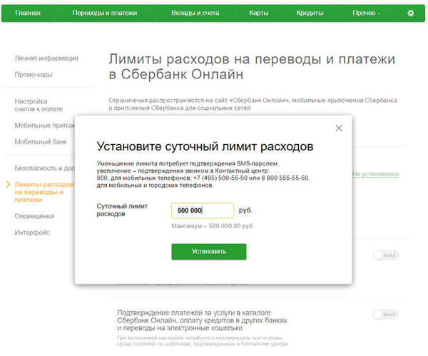 4. В графе "Суточный лимит на переводы и платежи" введите сумму, которую желаете переводить без подтверждений в контактном центре (максимум 1 млн. руб.), после чего подтвердите изменение лимитов вводом смс-кода.